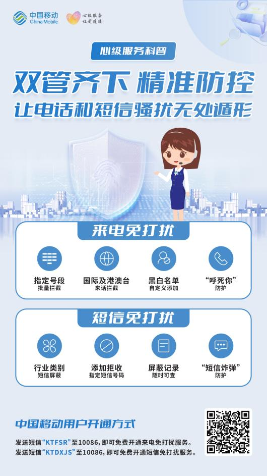 广东移动通过“总经理客户接待日”、“老友记小课堂”、“心级服务体验官走进移动”等活动,广泛推广防骚扰服务。同时,持续优化“来电来信免打扰”推广方式,客户可结合需求,个性化定制号段拦截、智能拦截等服务,致力于为客户构建清朗的通信环境。