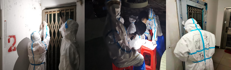 为了尽快减轻社区疫情防控人员的工作压力,实现精准防控,“铁军先锋”突击队员们立即全身心投入安装工作。白天,在30多度的高温下,队员们穿着密不透风的防护服,戴上N95口罩和护目镜,行走不到50米便双目模糊、汗流浃背、浑身湿透。晚上,他们两人一组,靠着手机电筒微弱的光安装至凌晨。他们连续奋战、不分昼夜,心中只有一个信念,快速完成任务,精准阻断疫情。热了,任由汗水模糊双眼;饿了,就吃口泡面;渴了,就灌几口矿泉水;累得实在不行了,就直接在地上眯一会儿。